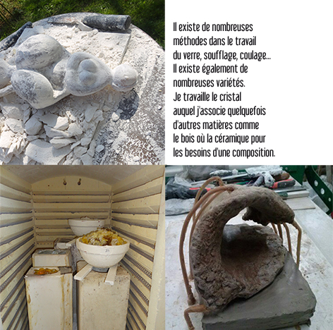 Tout commence par la sculpture de la pièce en cire à partir de laquelle est coulé un moule en plâtre réfractaire. L'étape de décirage (remplacer la cire en la faisant fondre par du verre liquide) fait alors complètement disparaître la création initiale pour ne laisser que l'empreinte de celle-ci.